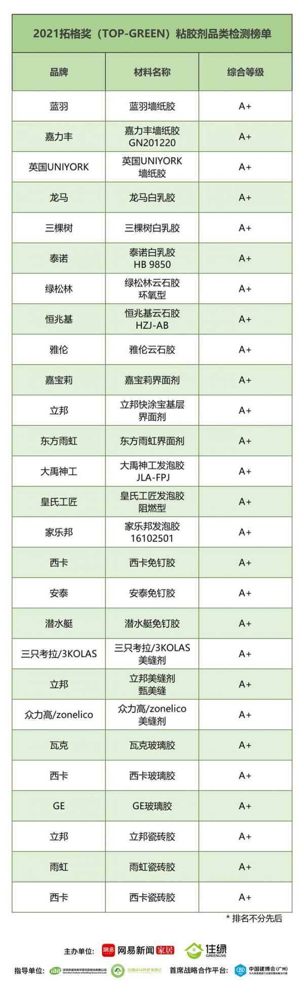 2021拓格奖 | 粘胶剂品类测评榜单公布:27款粘胶剂产品达到最高环保A+等级