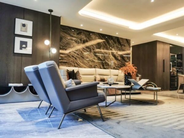 整体空间以灰为主色调,深浅灰搭配自然和谐,层次鲜明,营造出一种高级的空间感。地面沿用了简一云朵灰系列大理石瓷砖,配合简一的0.5mm密缝铺贴工艺,缝隙小到肉眼几乎都看不见了,整个地面仿佛一个整体。背景墙采用了黑灰色交替的瓷砖,以极简的色调塑造出优雅的空间氛围。直线米色沙发和雾霾蓝沙发椅围绕圆形茶几呈L形排列,这样不仅视觉效果流畅,提升了空间的整体气质,同时也缩短了交谈的距离,使沟通交流更加顺畅,有助于拉近亲友之间的感情。