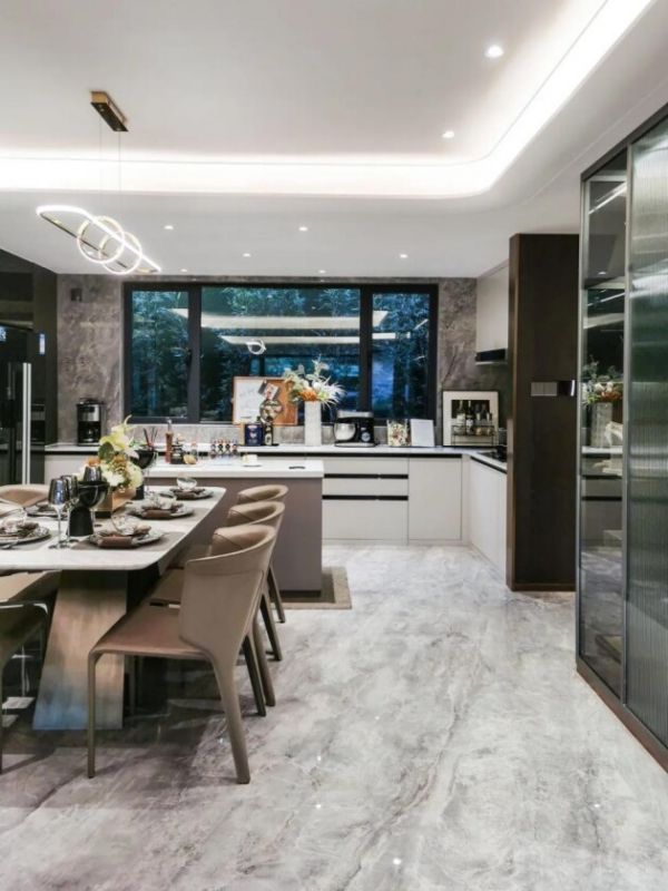 地面采用了简一云朵灰系列大理石瓷砖密缝铺贴,色调柔和的灰底+错综交替的肌理,散发出一种天然石材般的美感,传达着家的精致。简一的密缝铺贴使瓷砖连接更加紧密,同时也不用担心藏污纳垢,日常打理更方便。精致有序的餐桌给生活带来满满的仪式感,同时餐桌是圆角设计,对家里的小孩也比较友好,不用担心磕着碰着;搭配棕色的靠背椅,和谐统一又优雅低调,太有高级气质了。