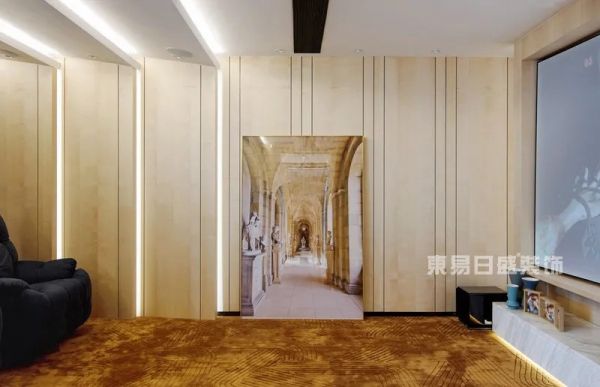 一个豪奢大宅,岂能缺少一个私密的影音空间,在东易日盛设计师特别打造的影音室中,浅驼色护墙板夹杂着黑色边框,紫色观影椅,长达几米的屏幕,三角形花纹的灰褐色地毯以及高低层级的设计,全方位打造出了影院级别的观影体验。