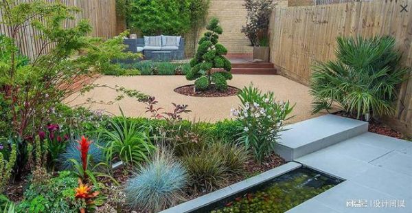 花园整体形状是长方形,面积相对来说不是很大,主要做出了三个分区:1.休息区域,此处做了起高的防腐木地台,摆放了藤编式防水沙发,种植了植物做装饰背景,此处可以做下午茶休闲区2.中间活动区,此处空间较大,可以做些户外活动,中间种植了树木做装饰,周边种植了各色花做装饰,非常好看3.就餐区,经过一个石板 隔断和一个小鱼池区,就来到了就餐区。地面铺设了石板地面,摆放了餐桌餐椅,是一个很好的就餐位置。开启你的愉快生活吧,美好快乐就是这么简单就得到了