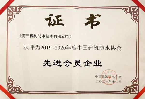 自成立以来,三棵树防水一直秉承着“为建筑赋能,让建筑更美好”的企业使命,积极履行企业社会责任,推动防水行业健康发展。经协会评审,三棵树防水荣获2019年-2020年度先进会员企业。