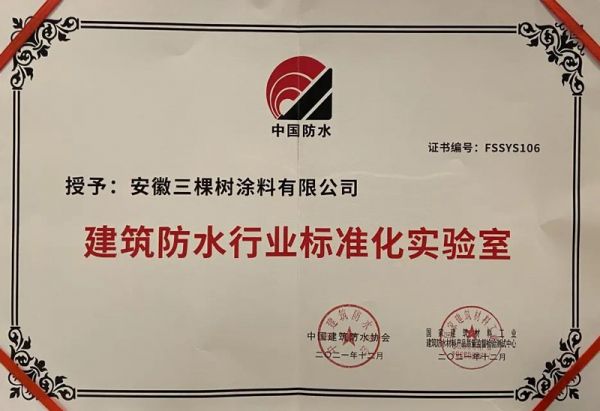 鉴于三棵树防水在生产工艺、材料、技术、装备、产品和质量管理等方所取得的创新成果,经专家组评审,此次三棵树防水安徽实验室被评为“建筑防水行业标准化实验室”。