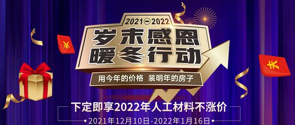 明年准备装修新房的朋友一定要了解下星艺装饰近期推出的特别“跨年”活动暨岁末感恩暖冬行动,此次活动时间为2021年12月10日至2022年1月6日。活动主旨是“用今年的价格,装明年的房子”,简单来说就是活动期间下定即享2022年人工材料不涨价优惠。
