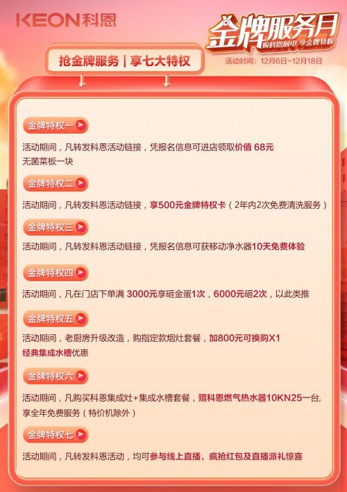 科恩“金牌服务月”经过精心筹备盛大开启,购科恩厨电,享金牌特权!以领军者姿态,开启行业服务新典范。用户不但可以通过科恩全国专卖店直接获取服务,还可以通过线上报名、砍价形式获得权益,结合线下门店金牌服务,聚焦客户最及时服务需求,七大特权限时抢购!