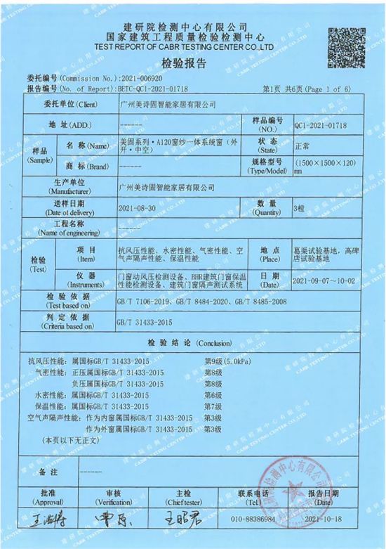经权威机构检测,美诗固系统门窗平框产品,抗风压性能达国标最高级9级标准。可抵抗5000帕以上风压。(如果门窗完全逆风的话,5000帕大约是10级飓风的风压,如果风向与窗户平衡,12级台风的风压也达不到5000帕)。