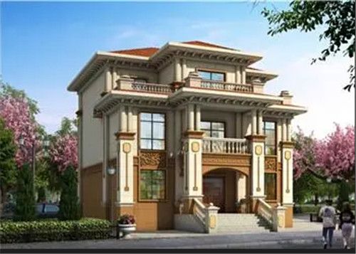 这款房屋看起来比较豪华,欧式构件和真石漆的搭配,让整个房屋充满了欧式的气息。一层棕色真石漆+二三层米黄色真石漆的搭配,能很好的凸显出房屋的层次感。橘红色琉璃瓦设计,既清新又时尚。门前的罗马柱,既可以让房屋更加庄严气派,也能表现出主人家的英气。