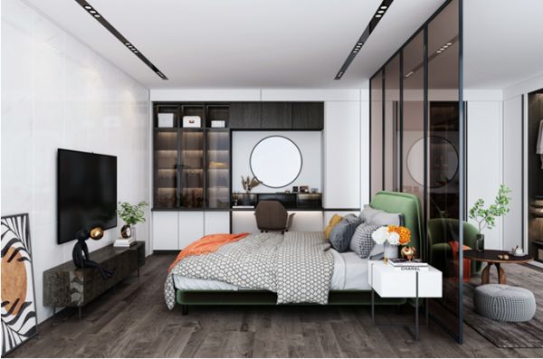 曼居的材质选择细腻而富有质感。哑光纯色的门板,亮光的肌理纹路,材质表现清新自然,以平静舒缓的纯色和适当的留白彰显空间与内心的交流,极尽表现生活的舒适性。门板芯板搭配金属材质,比例精巧合宜,结构装饰巧夺天工。亮光肌理纹路PET的风格鲜明,每一点细节都彰显出品质的提升。而内嵌于卧室空间的玻璃门的设置、月亮门装饰背板,让整个空间增添了一分细腻之感,使得整个私密空间温馨又神秘。收纳的隔断,提高了衣裤鞋帽的规整尺度,隔不断的是贯穿于整个家居空间的细腻品质感。