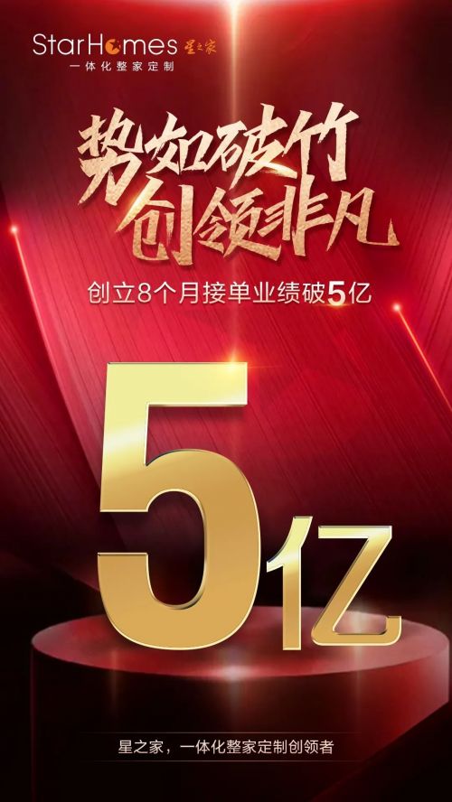 2021年12月3日,StarHomes星之家接单业绩累积突破5亿①。仅成立8个月,作为新生品牌——星之家在强手如林的一体化整家定制新赛道,完成了一个漂亮的抢跑,以过硬的销售业绩夯实市场标杆地位,身披荣光,步伐铿锵,乘势而上,聚势而强。