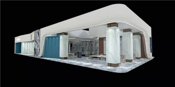 整个展馆呈半封闭式,透过晶莹的落地玻璃橱窗,内部的岩板连纹方柱一览无余,简洁大气的气质呼之欲出。前厅运用解构、重造的方法,重点展现1200×2400mmAI无限连纹产品铺贴效果,堆砌的3-4层连纹大方料既是实景展示,也是座席——充分感受巨型LED显示屏带来的感官震撼。