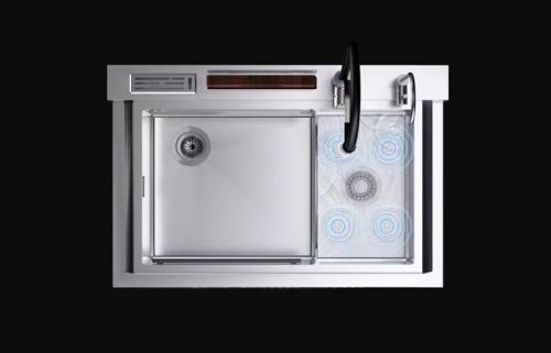 在保留原有的洗碗机模块、净水器模块、垃圾处理器模块、水槽洗涤模块、食材切配模块之余,创新增设砧板刀架烘消模块、超声波果蔬净洗模块,功能的多样性有效优化厨房布局,用户可快速完成全部烹饪前的准备工作,从而减轻烹饪压力。