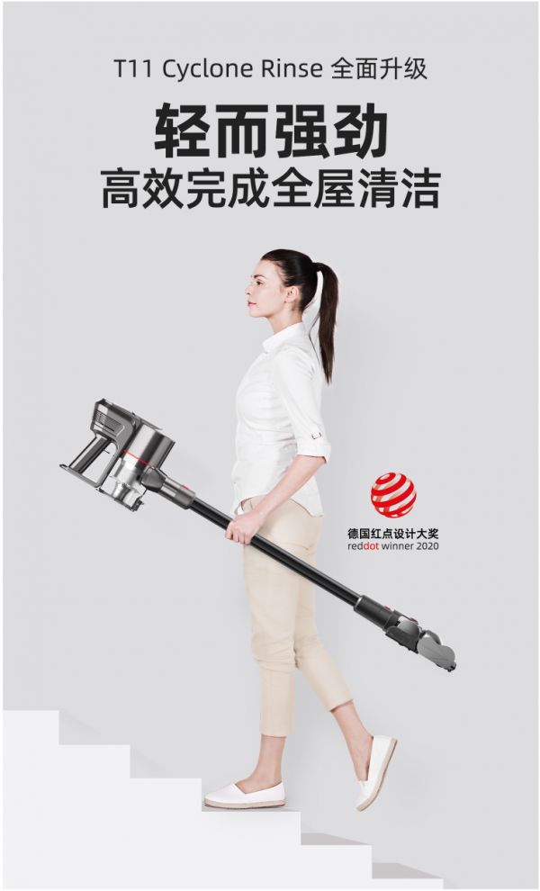 小狗T11 Cyclone Rinse是一款操作轻便的吸尘器,它的机身采用趋小化、轻量化设计,主机身仅1.48KG,减少因机器过重造成的体力消耗及使用不适,更适合追求轻便的人群使用。小狗T11 Cyclone Rinse虽然轻便但吸力不小,150AW强劲吸力,多锥旋风技术+整机5重过滤可拦截99.82%小至0.3微米的微尘,确保排出洁净空气;智能感应技术可实时检查滤芯状态,保护电机安全。