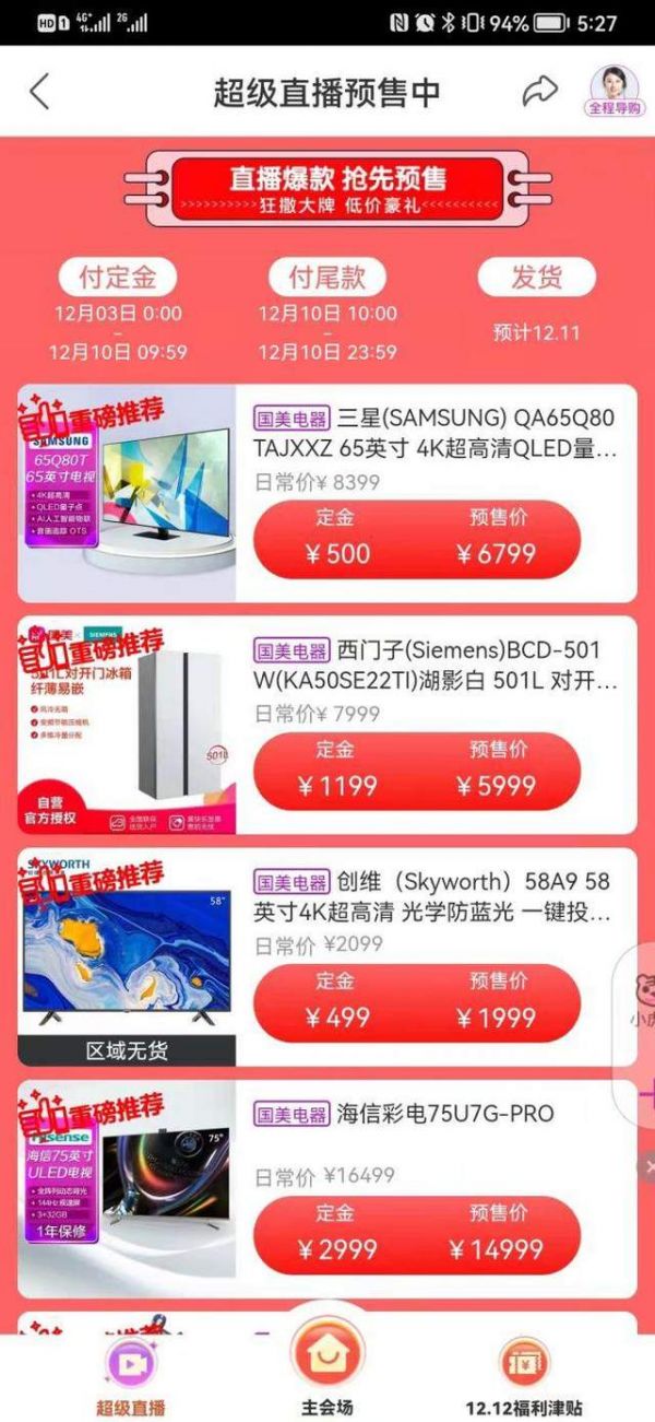 此次超级直播夜的多款家电好物,都能提前预售价尝鲜,只要在12月3日0:00-12月10日09:59支付定金,并在12月10日10:00-23:59完成支付尾款,就能快人一步尝鲜新品、潮品、爆品。