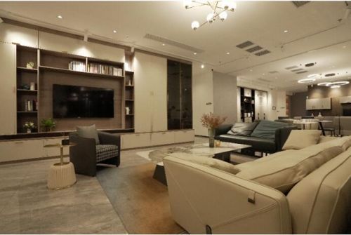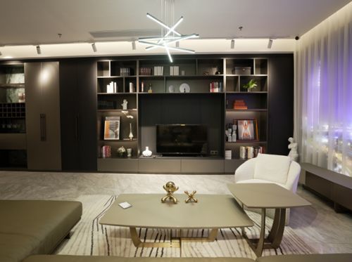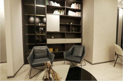 客厅后方的小型会客区域,小小范围却显神秘、安全空间,多格置物柜内嵌摆放,透明玻璃加上无遮挡,让收藏品摆放清晰、多样。真皮单独沙发,现代感与艺术感展现简约的轻奢风采。超大空间的多功能置物柜与整体空间相契合,不显复杂,而显简约大方之轻奢氛围。