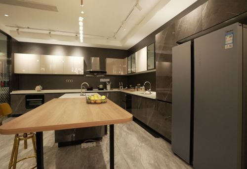 在餐厨空间中,没有隔板与客厅隔开,加深人与人之间的亲切交流,超大储物空间,大理石与原木的结合,简约大方,透明橱柜专门划出一块储酒,烤箱与冰箱内嵌,天然气灶台放中间,前方置物架方便放材料与取物,水流就安置与旁边,上方集中型油烟机,既方便又避免了油渍污染,里外多排灯照亮,使餐厨作业更明亮。
