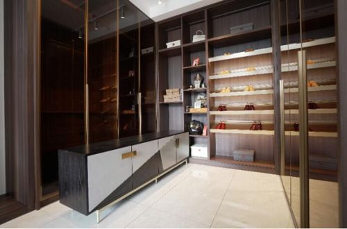 为了满足女主人放置衣物的需求,设计师精心打造了一个超大空间的衣帽间,专门摆放鞋、包、饰品以及衣物,透明玻璃门让衣物摆放一目了然,在灯光的柔和照耀下,清晰明亮,轻奢气息的美好惬意给予居住者。