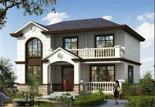 图片描述:这款二层楼的房屋采用也是新中式的设计,白色的外墙和栏杆配上深色的窗框、屋檐,可以让房屋看起来更加的成熟稳重,彰显主人的身份和地位。而气派的红色大门,既好看耐脏,又象征生活红红火火,非常符合农村人的审美。