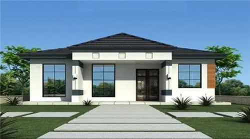 图片描述:这款带花园的一层别墅看起来非常的时尚简约,外观黑+白的搭配,既低调又不容易过时。而方格窗户的设计,则可以增加室内的采光和通风,让业主居住起来更加的舒适。人字形的斜顶屋顶,好看又方便排水。