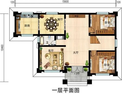 一层户型:客厅、厨房、吃饭厅、卧室、厕所
