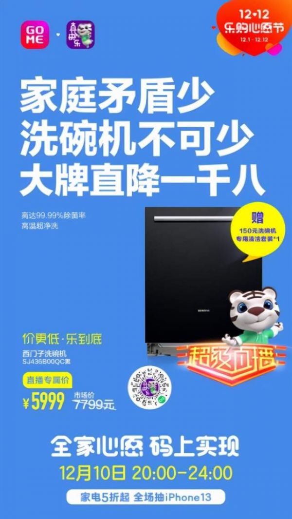 一个追求精致生活的人,不管是在出租屋,还是自己的家,都需要一些实用的精品好物,来提升自己的生活格调。12月10日,在“真快乐”双12超级直播夜,涵盖智能冰洗、空调电视、厨房卫浴、生活家电、母婴玩具、家居日用、床品家纺、食品酒水、生鲜……全品类好物通通低价让利,让消费者享受实实在在的实惠。并且,这些低价好物都是出自一线大牌,像创维酷开、小米、TCL、苏泊尔、戴森,九阳、小熊、索尼等,品质值得信赖。其中,西门子12套全嵌入洗碗机,高温超净洗,除菌率高达99.99%,原价7799元,大牌直降1800,直播专属价只要5999元乐享,超级划算!