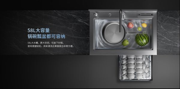 作为一款集成洗碗机,森歌U3D集成除菌洗碗机上方为 58L 大水槽,超大空间足以清洁炒锅等大件厨具。而水槽还可通过附加的砧板、沥水帘、小套槽,提供加工备餐、清洁食材等不同功能,丰富了水槽的功能。此外,它同样自带水龙头、刀架、皂液器等厨房必备器具,更有效节约了台面空间,让厨房台面更加简洁。