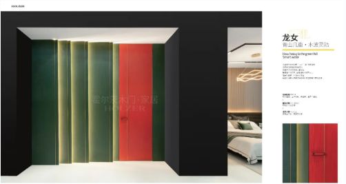 “龙女”打破了传统木门的工艺限制,利用金属线条门+墙板的同水平延伸,将无框超高木门与墙面完美融合。运用独特大胆的色彩设计,高饱和度的明艳红搭配内敛低调的石苔绿,衍生出兼具艺术气息与功能性的木作家居,赋予家居生活更为独到的东方韵味。
