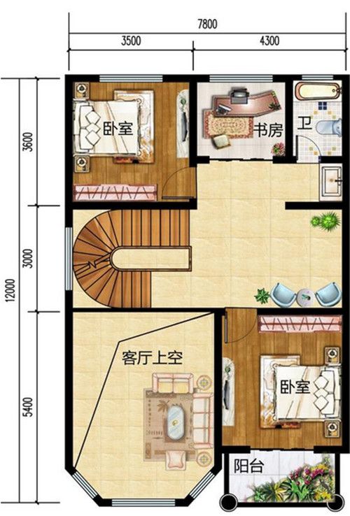 二 层:客厅上空、卧室x2、书房、厕所、阳台