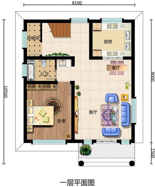 一层户型:客厅、杂物间、吃饭厅、厨房、卧室、厕所