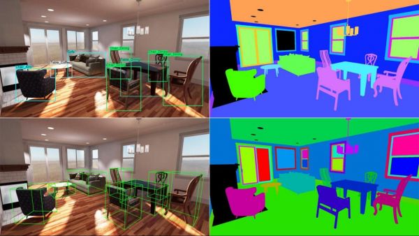 例如下图,就展示了Unity家居设计在其他参数不变的情况下,如何实现其中四种元素的随机化。相较于参考数据稀少的训练数据,Unity家居设计带有更多标签类型的数据可以拓宽CV的应用范围,进而更高效地帮助客户实现家居自动化开发。