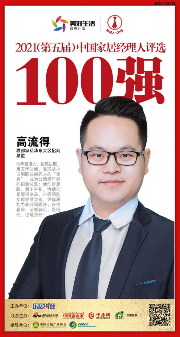 新浪家居 12月12日,2021(第五届)中国地产新时代盛典在北京举行,“2021中国家居经理人100强”榜单正式揭晓。联邦家私华东大区招商总监高流得荣获“2021中国家居经理人100强”。