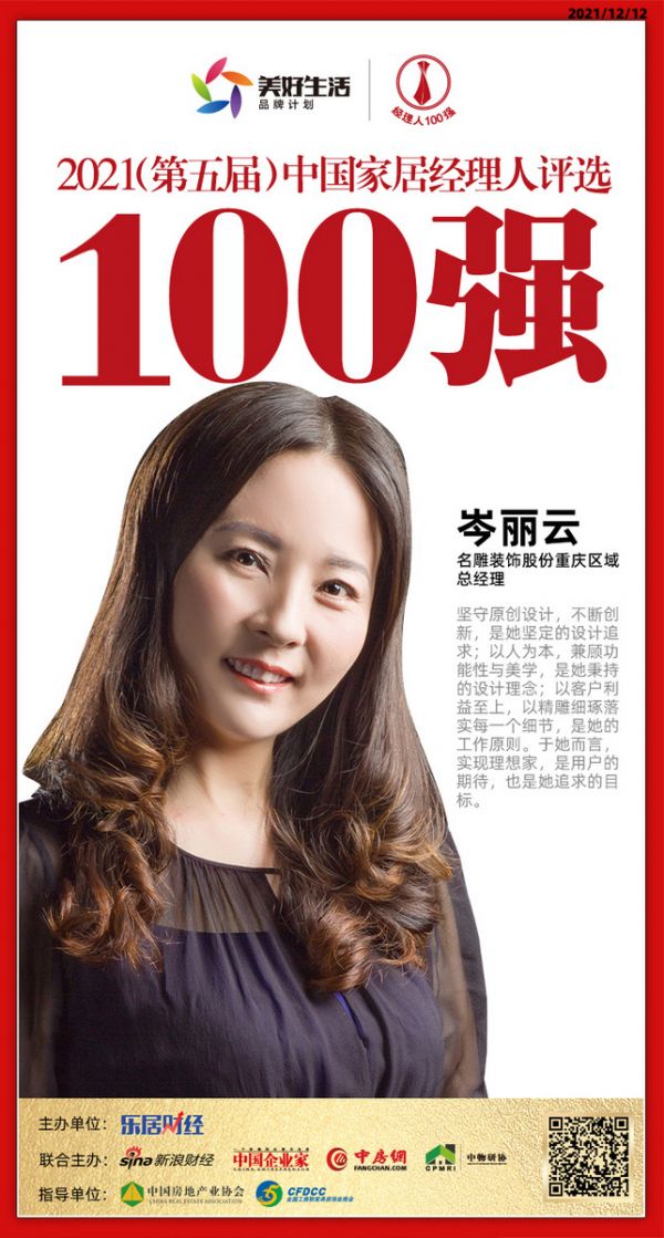 新浪家居 12月12日,2021(第五届)中国地产新时代盛典在北京举行,“2021中国家居经理人100强”榜单正式揭晓。名雕装饰股份重庆区域总经理岑丽云荣获“2021中国家居经理人100强”。