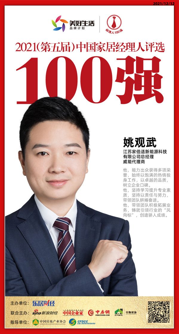 快讯:江苏家倍适新能源科技有限公司姚观武荣获“2021中国家居经理人100强”