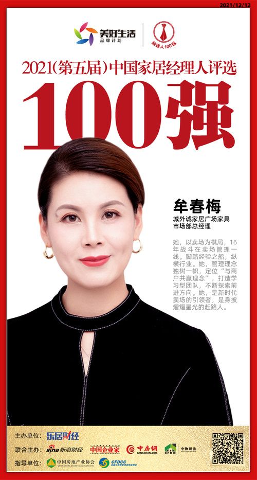 新浪家居12月12日,2021(第五届)中国地产新时代盛典在北京举行,“2021中国家居经理人100强”榜单正式揭晓。城外诚家居广场家具市场部总经理牟春梅荣获“2021中国家居经理人100强”。
