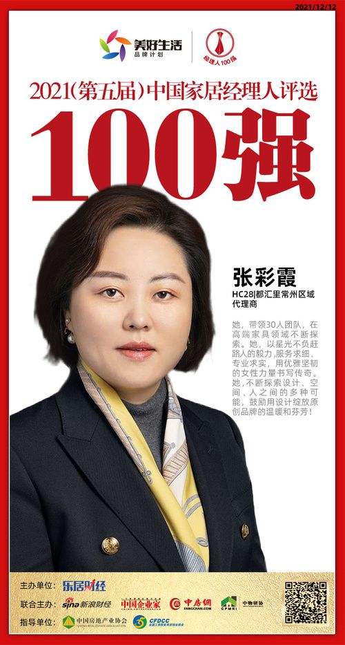 新浪家居12月12日,2021(第五届)中国地产新时代盛典在北京举行,“2021中国家居经理人100强”榜单正式揭晓。HC28|都汇里常州区域经销商张彩霞荣获“2021中国家居经理人100强”。