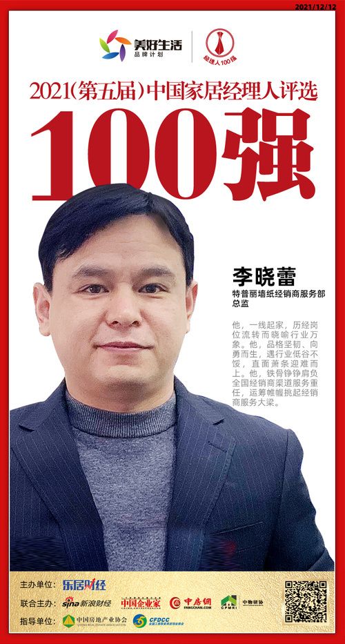 新浪家居12月12日,2021(第五届)中国地产新时代盛典在北京举行,“2021中国家居经理人100强”榜单正式揭晓。特普丽墙纸经销商服务部总监李晓蕾荣获“2021中国家居经理人100强”。