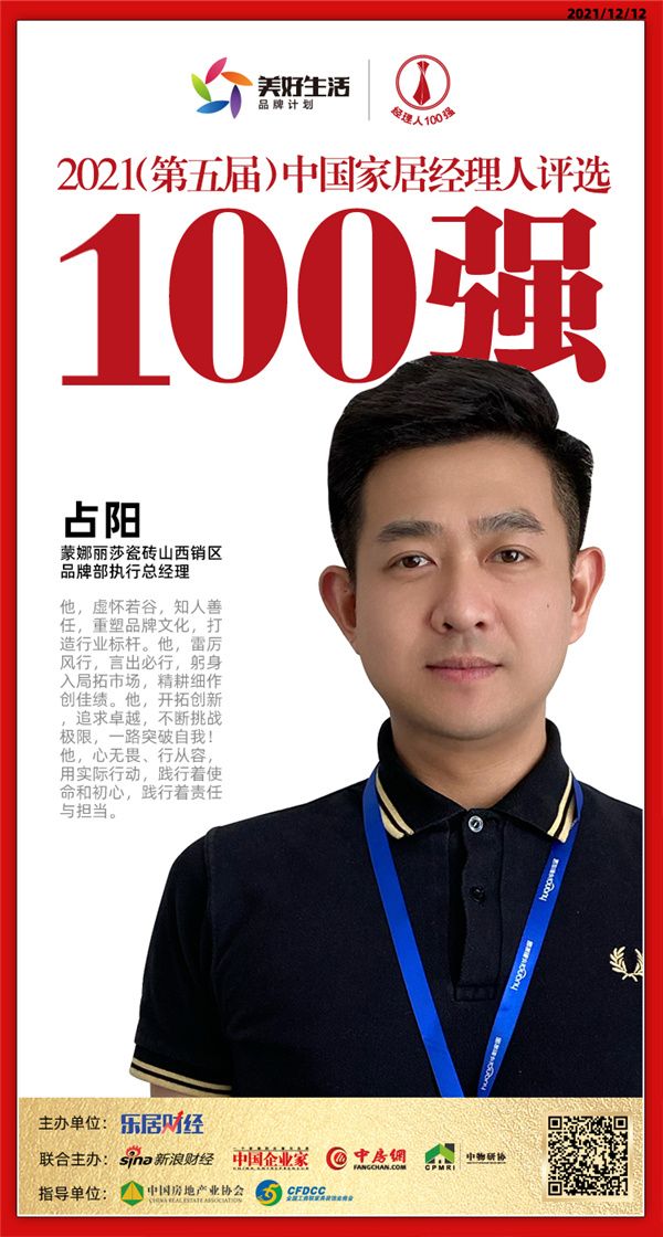 快讯:蒙娜丽莎瓷砖山西销区品牌部执行总经理占阳获“2021中国家居经理人100强”
