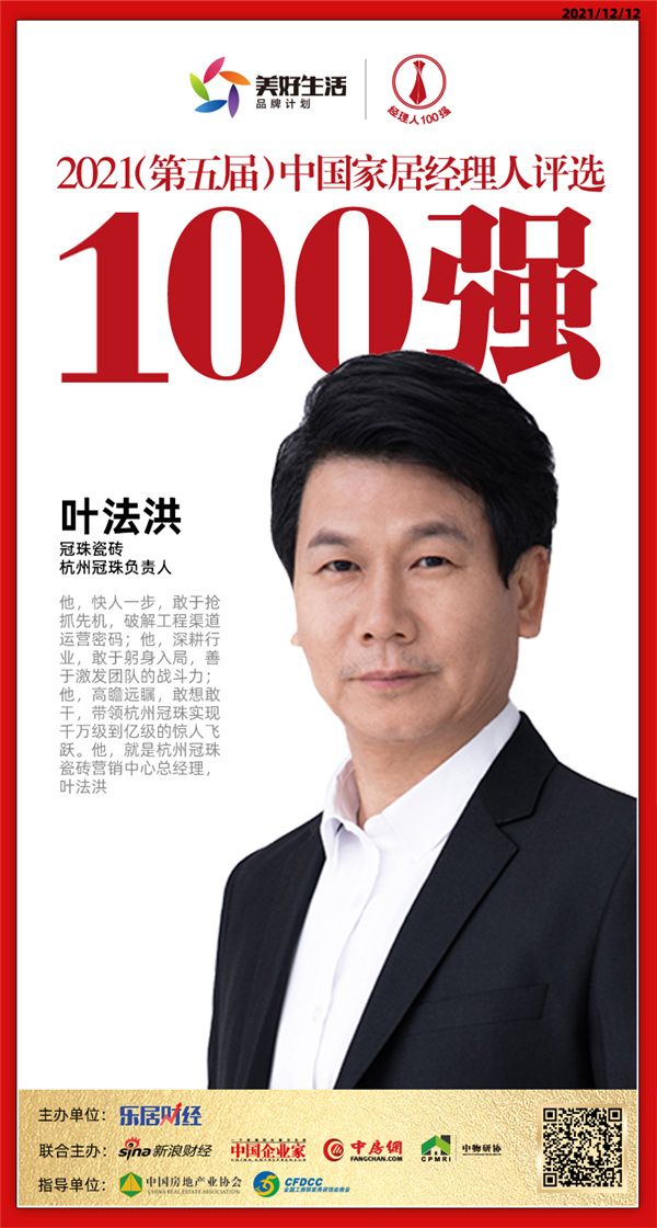 新浪家居讯 12月12日,2021(第五届)中国地产新时代盛典在北京举行,“2021中国家居经理人100强”榜单正式揭晓。冠珠瓷砖杭州冠珠负责人叶法洪获“2021中国家居经理人100强”。
