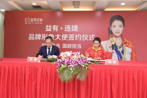 2021年12月11日,时尚健康的北京国贸中心阳光明媚,EU益有定制CEO李攀先生与跳水世界冠军连婕女士正式签约并宣布,“国际级运动健将”连婕女士成为益有品牌形象大使。全国工商联家具装饰业商会办公室主任及社会责任指导办公室主任张怡然女士、德普新源集团中国区供应链总监高杰先生、益有参事官及大商群英会会长罗超先生,益有千万大商代表、在京的友人及数家媒体人,共同见证了这一高光时刻。