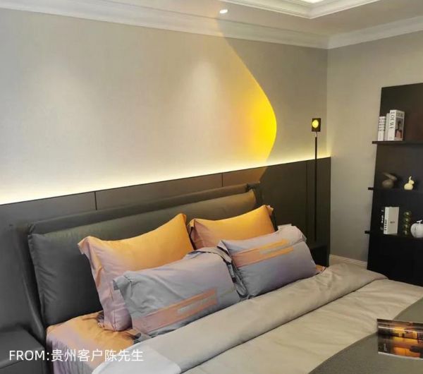 灯光与墙布是一对天然的cp,灯光运用得恰到好处,能将墙布的高级质感发挥到极致。内敛的淡雅灰竖纹肌理墙布,在光线的作用下,让卧室释放出冬日里别样的浪漫温馨感。