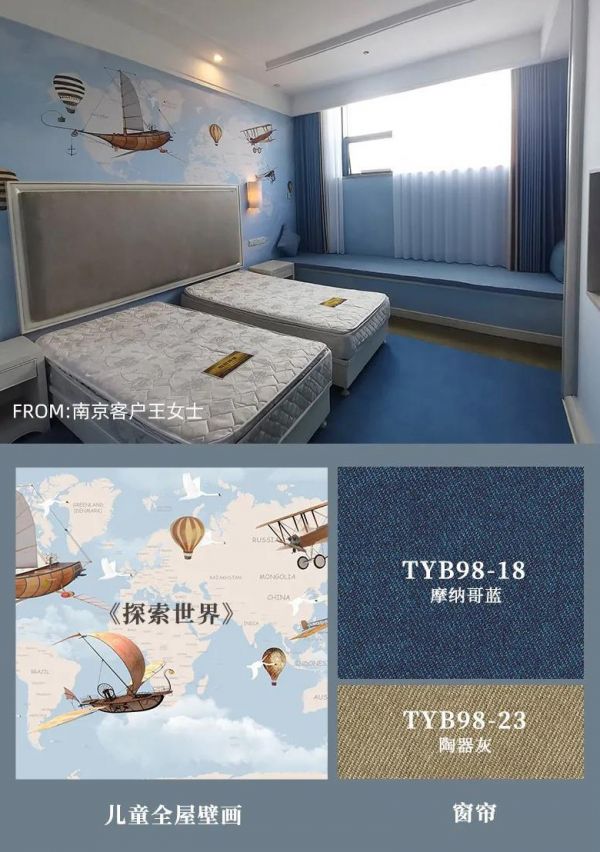 一幅充满童趣的壁画就可以拯救一个儿童房!选用以天空蓝为主色调的壁画,搭配摩纳哥蓝与陶器灰拼接的窗帘,让成长的一块小天地显得格外俏皮可爱、活力满满。