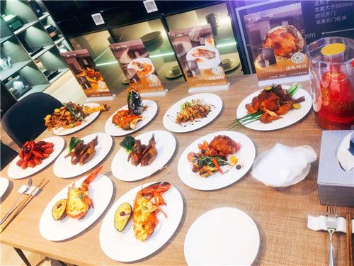 但是在三翼鸟体验店里我们却看到了不一样的场景,在智慧厨房场景中,类似的特色菜品不仅做法简单,而且可以同时做好几道菜。工作人员现场用智慧蒸烤箱烤制功夫烤鸡、至尊烤鸭、新西兰烤牛腿、剁椒鱼头等大师菜,只见他将预制菜依次放入烤箱,选择菜谱一键启动烹饪。