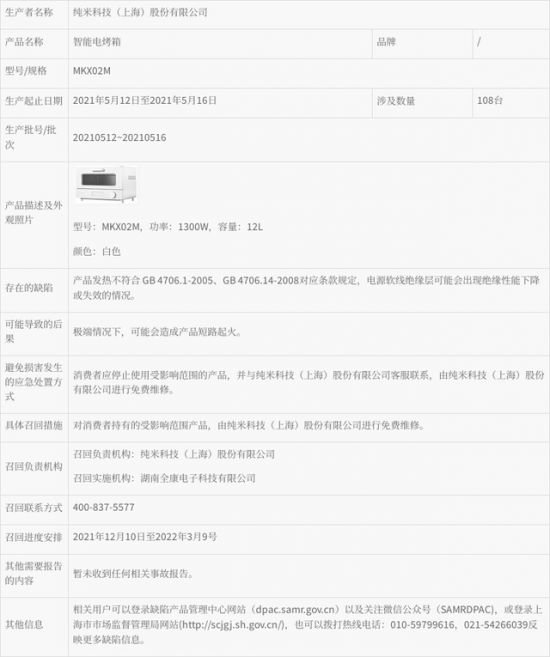 家电快讯|纯米科技(上海)股份有限公司召回部分智能电烤箱
