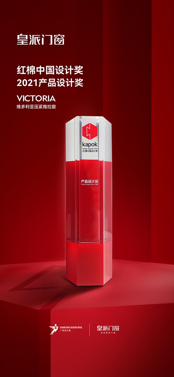在本次设计周上,皇派门窗「维多利亚压紧推拉窗」凭借超前设计,俘获一众评委的芳心,从激烈的竞争中脱颖而出,荣获“红棉中国设计奖•2021年产品设计奖”。