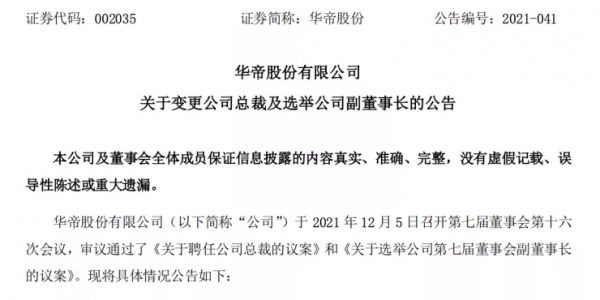 华帝股份(002035.SZ)近日发布公告称,由于工作调整的原因,潘垣枝申请辞去公司总裁职务。董事会同意由董事长潘叶江兼任公司总裁。潘叶江和潘垣枝分别是华帝创始人之一潘权枝的儿子和弟弟。