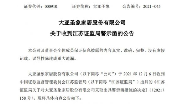 2021年12月6日晚,大亚圣象(000910.SZ)发布公告,当日收到中国证券监督管理委员会江苏监管局出具的《江苏证监局关于对大亚圣象家居股份有限公司采取出具警示函措施的决定》(〔2021〕158 号)。公告称,大亚圣象存在“董事、监事、高级管理人员2019年报酬披露不准确”和“财务管理和会计核算不规范”两大违规行为,从而导致公司相关定期报告信息披露不准确,违反了《上市公司信息披露管理办法》第二条、第二十一条的规定。