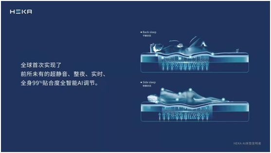 董艳清表示“人在睡眠状态下最需要人工智能,人体睡眠时大脑在休息,无法有意识的通过肌肉保护我们的身体健康和颈椎、腰椎,这时最需要AI智能系统的保护。”HEKA AI床垫第一次真正意义上实现了能够在不打扰的情况下修复人体,管理每一个睡姿下的健康支出,减少神经分布的压迫与关键血管压迫,成功优化颈椎与腰椎的承托,提升血液循环,保持呼吸通畅,而这一切动作都无需人为操控,也不会发出一点噪音。