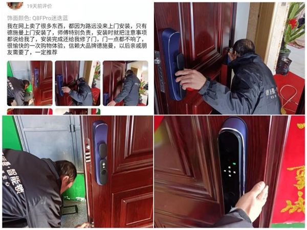 家在御道口牧场的客户,下单了德施曼3D人脸视频锁月光宝盒Q8FPro,他好评道:“网上买了很多东西,都因为路远没来上门安装,只有德施曼上门安装了,信赖大品牌德施曼。”