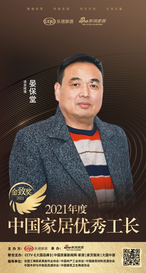 2021年12月18日,“智见·2021中国家居新时代盛典暨金致奖颁奖典礼”在广东佛山盛大举行。由乐居家居主办、新浪家居承办,CCTV•大国品牌、中国质量新闻网•家居、家页智库、大国中居联合主办的2021中国家居「金致奖」评选在盛典隆重揭晓。工长晏保堂荣获「2021中国家居优秀工长」称号。