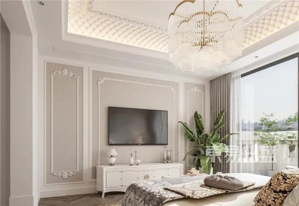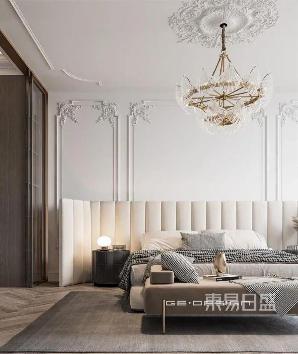 卧室作为人每天待得最久的区域,也是提升幸福感最重要的空间。所以东易日盛的设计师在细节上下足了功夫,营造了浓浓的法式浪漫气息。吊灯和墙面的重工雕刻,对称的床头背景墙,增加房间的稳重感,在硬装细节上注重品质,软装家居及摆件成为,整个项目的点睛之笔,充足的自然光线洒入空间,幸福由此而生。