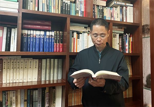 |邱海亮家里的大书柜是他最喜欢的一角。